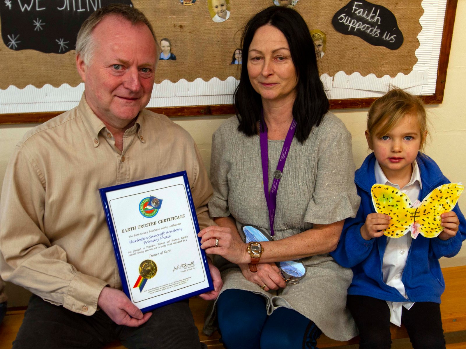 The Photo (right) Trevor Graham, Chair of Redenhall with Harleston Town Council, presents Mrs Bev Beaumont, a teacher at Harleston Sancroft Academy Primary Phase with the Earth Society Foundation, Earth Trustee Certificate. The Certificate has been awarded to the pupils at the Academy by the Foundation, which is based in New York, for the role the pupils are playing in the build-up to the Community's Nature Recovery... WeCan programme . Their work to date is focusing on butterflies.