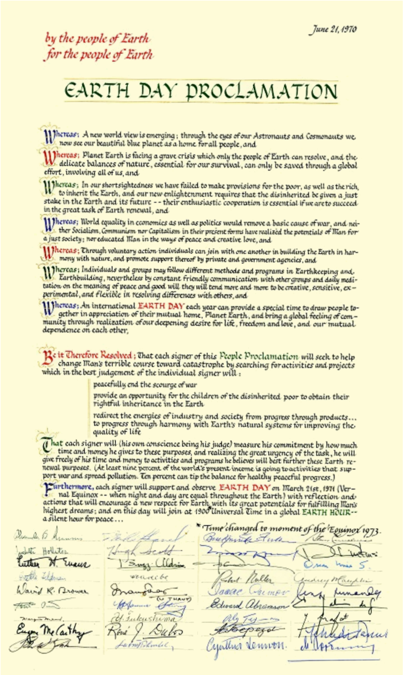 John McConnell wrote and created the Earthday Proclamation in 1970 and by 1973 it was signed by over 30 Global dignitaries.